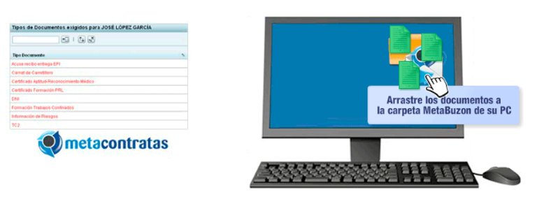 MetaBuzon es una herramienta gratuita anexa a MetaContratas que nos permite subir cientos de documentos arrastrándolos a una carpeta de nuestro ordenador. Mediante un sistema de renombramiento de los documentos, estos se asignan automáticamente al tipo de documento y a la empresa o trabajadores que correspondan.